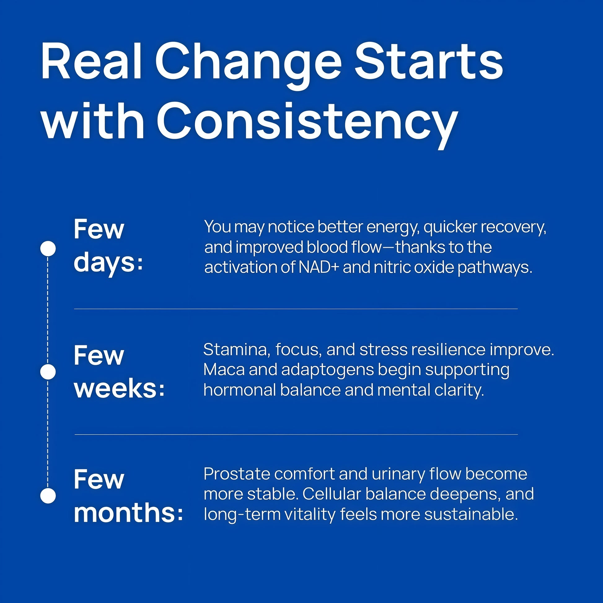 The main benefits of this NAD+ supplement for men include promoting healthy circulation and inner energy, supporting healthy oxygen flow, providing prostate and urinary health support, fueling cellular energy, and offering antioxidant support to help reduce fatigue and promote long-term wellness.