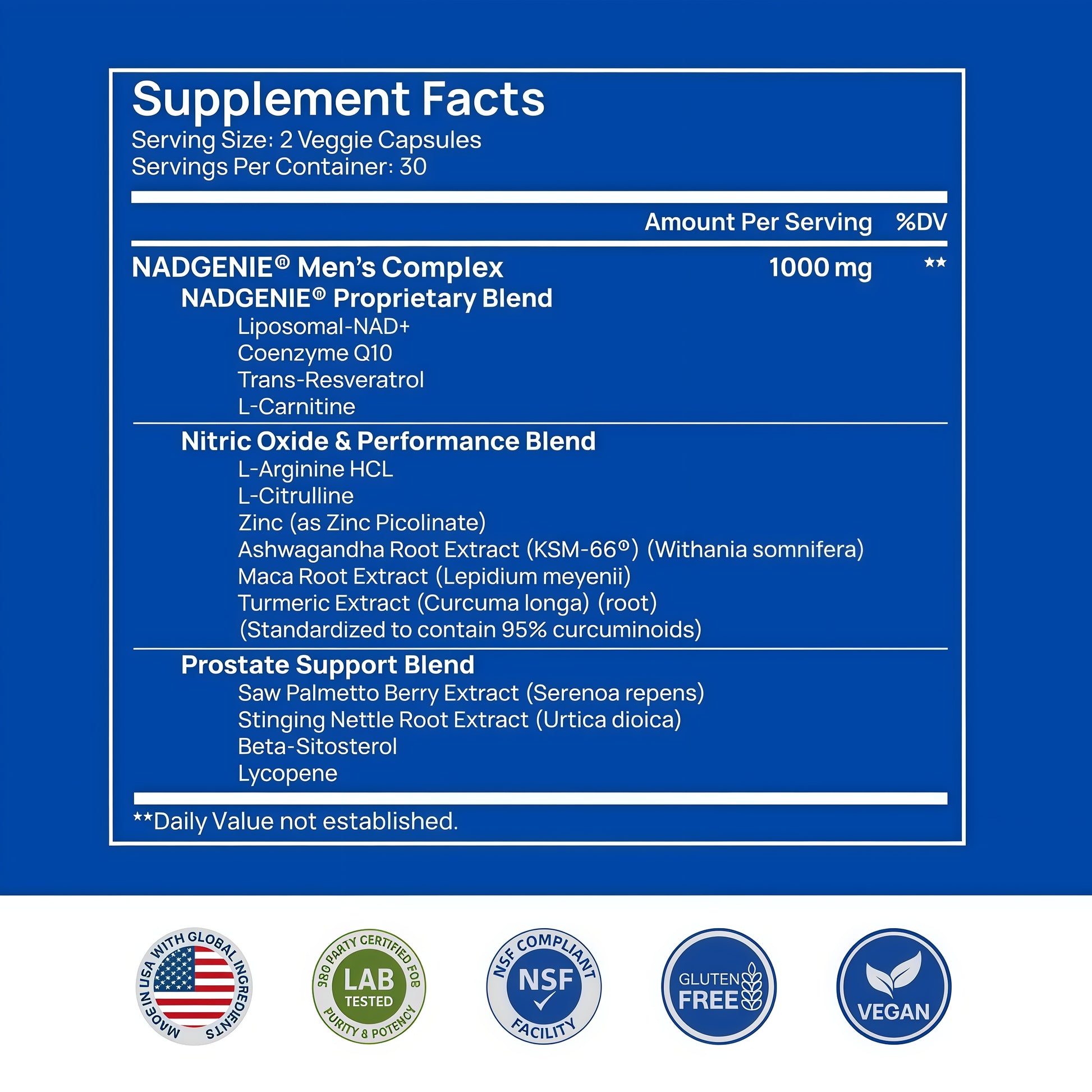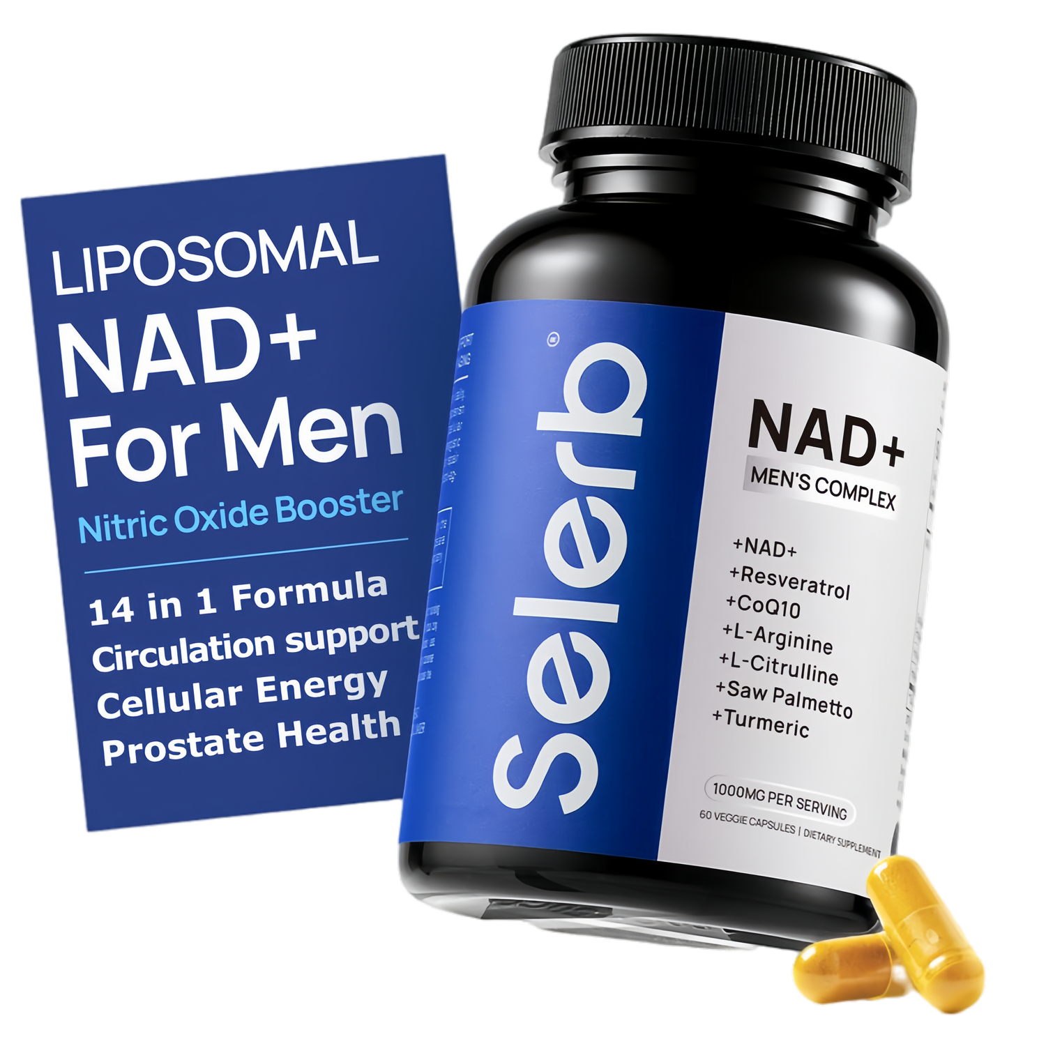 Selerb NAD+ Men’s Complex combines liposomal NAD+, CoQ10, and Resveratrol with ingredients like Arginine, Ashwagandha, Saw Palmetto, and Lycopene to support cellular energy, blood flow, hormonal balance, and prostate health. With 14 powerful ingredients, it offers comprehensive wellness support beyond typical NAD+ supplements.